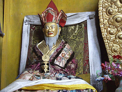 Terdag Lingpa restored this great title in the 17th century, and when Terdag Lingpa was about to pass into parinirvana, it is said that he requested his disciples and sangha members not to grieve but to realize the truth of impermanence. He then instructed them that if they had devotion for him and truly wanted to benefit beings, they should do the Kagyed ceremony each year. From that time on, the Kagyed drubchen has been held every year at Mindrolling to commemorate the passing of this peerless guru and founder of Mindrolling.